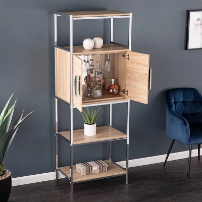 Upgrade your home bar storage with the Aiden Lane Befail Tall Bar Cabinet with Wine Storage. A double-door cabinet and three open shelves store everything from glassware to spirits, while a convenient pull-out tray serves up cocktails and appetizers in style. Add this modern wine cabinet to your dining room to enjoy mixed drinks at your next dinner party, or tuck into your living area to double as a bookshelf or coffee bar. Make the most of your small space or open concept floorplan with this tall bar cabinet. Overall: 25.25” W x 15.75” D x 68” H