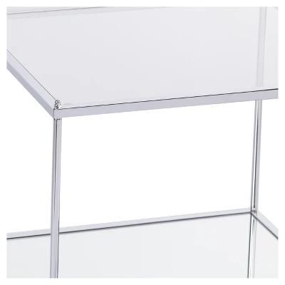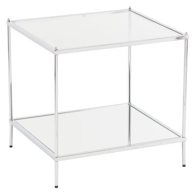 Whether placed beside your couch or sidled up against a bare wall, the Benton Glam Mirrored End Table from Aiden Lane instantly spices things up in your living room. Featuring a minimalist design and sleek lines, this glass end table features a smooth glass tabletop supported on a chrome-plated metal frame, which brings a contemporary flair to your interiors, while the lower glass shelf adds another layer for displaying decor pieces and antiques. A stunning piece to transform your living space, this modern glass end table brings a glamorous focal point to your interiors.