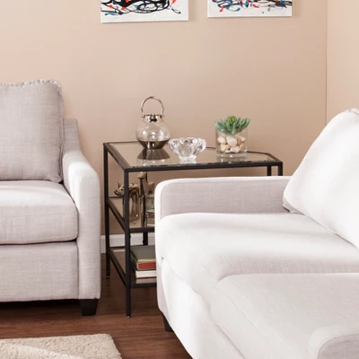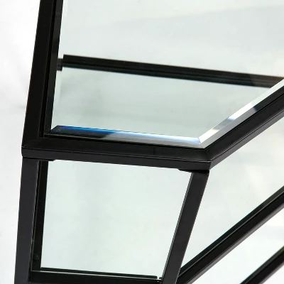 Add sleek minimalist style to your living room with the Conrad Metal/Glass Corner TV Stand from Aiden Lane. With two angled corners and a triangular shape, this simple TV console fits into corners so you can make it work in any room. Three glass shelves can support your media equipment or decorative pieces.