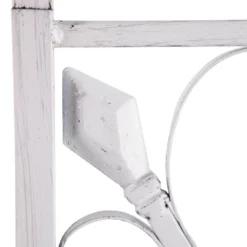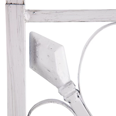 Tidy clutter in style with the Aiden Lane Entryway Hall Tree Bench with Storage Distressed White. Open shelving and multiple hooks provide storage options for jackets, backpacks, and pet gear, while a cushioned bench gives you a convenient place to pack a bag or put on your shoes. Classic scrollwork decorates the distressed metal frame, bringing rustic style to your entryway, mudroom, or open concept living space. Organize everyday essentials without sacrificing your design when you bring home this versatile hall tree.