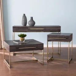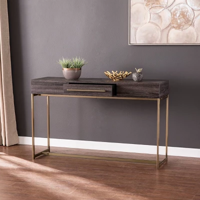 Odds and ends find their place with the Aiden Lane Frondi Long Console Table. The slim, narrow design slides neatly into your entryway or open concept space, while the contemporary, mixed-material construction brings a fresh look to your home. Display décor pieces or your book collection on the long tabletop, and tuck bills and keys into the convenient drawer. Add sleek storage where you need it most when you place this narrow sofa table in your hallway or living room.
