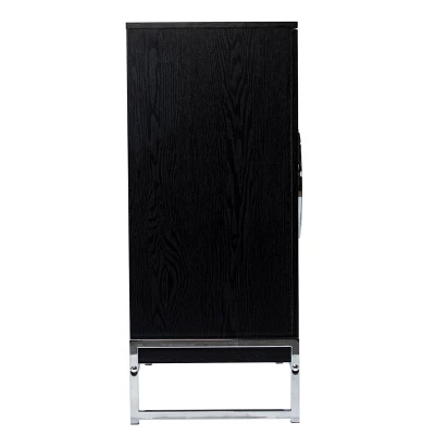 Modernize your home bar storage with the Aiden Lane Henstinger Double-Door Bar Cabinet. Six spacious shelves and interior bar storage keep your wine collection or home bar station neat and tidy, while a sleek black finish and chrome accents add a cool, contemporary feel to your entertaining space. Tuck this wine cabinet into your dining room to welcome dinner party guests with a drink, or place in your open concept space to organize bar essentials at your next celebration. Bring home sophisticated style with this two-tone bar cabinet. Overall: 33.25” W x 16” D x 37.25” H.