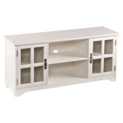 The Remey TV/Media Stand from Aiden Lane lets your family enjoy the latest video games, movies and sports games in style and comfort. This attractive console table with shelves and cabinets keeps your consoles, controllers, DVDs, books and more separated and organized. You’ll never lose another remote or favorite game when you can see them behind the windowpane cabinet or in the open cubbies. This rectangular console table with adjustable shelves fits to your needs and style, so it will grow with you and your family.