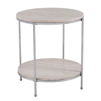 Round out your living room décor with the Aiden Lane Sula Round Faux Stone End Table. Faux travertine surfaces bring elegance to your design, while a metallic frame modernizes your space for a sleek, sophisticated feel. Slip this side table next to your reading chair to relax with the latest novel, or tuck alongside your living room sofa to keep a cup of coffee and the TV remote within reach. Style and storage join forces with this faux stone accent table.